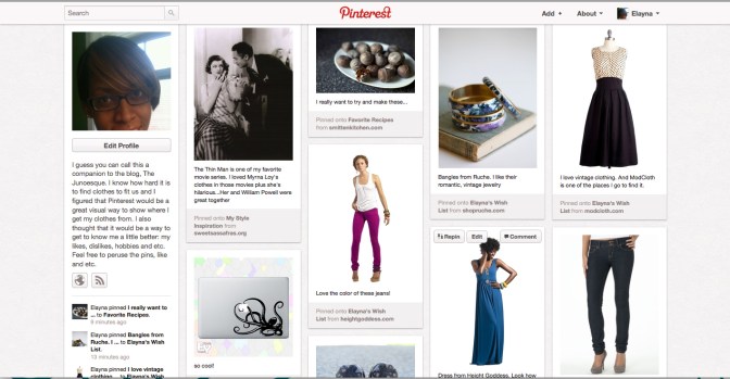The Junoesque is on Pinterest! I decided to get on Pinterest partly because of curiosity as to what the buzz is about but also I thought it would be a great visual tool to show you where I find clothes. I think a tall women’s best bet to find clothes is to go online. There are a plethora of places that I go to find pieces. My pins will reflect what I like and my style. Maybe it will help you to find pieces that you like. My boards are still under construction but stay tuned because I will be adding to them daily!