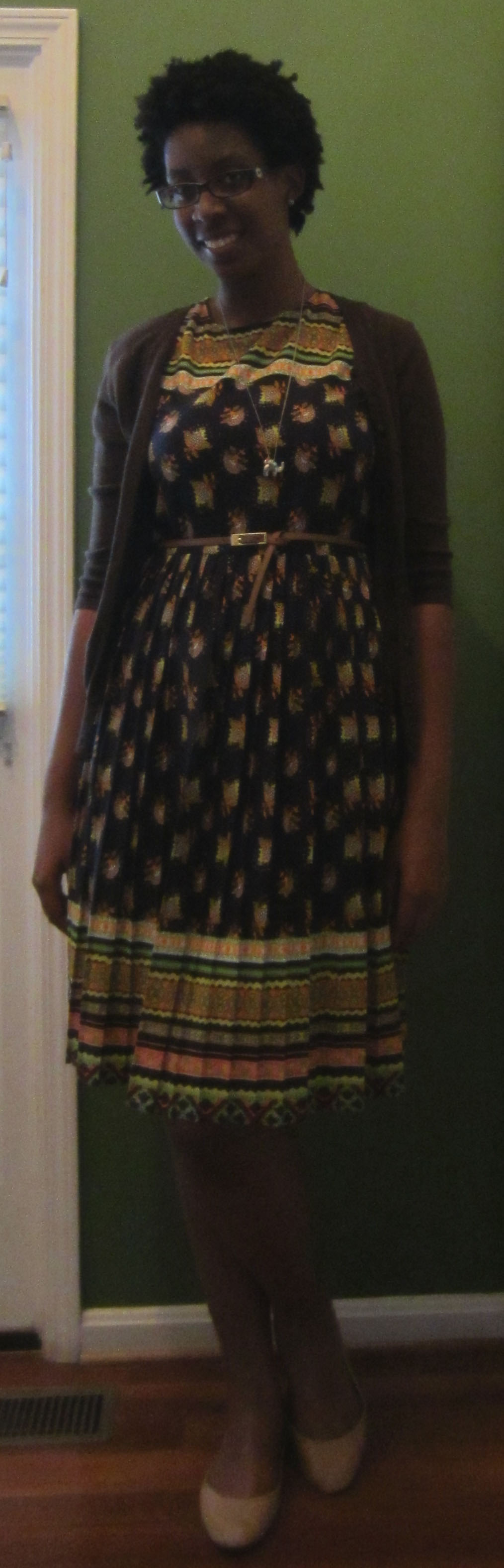I wore it to work last week with a brown cardigan and my Steve Madden Tailor flats in Cognac from Barefoot Tess to go with the belt.