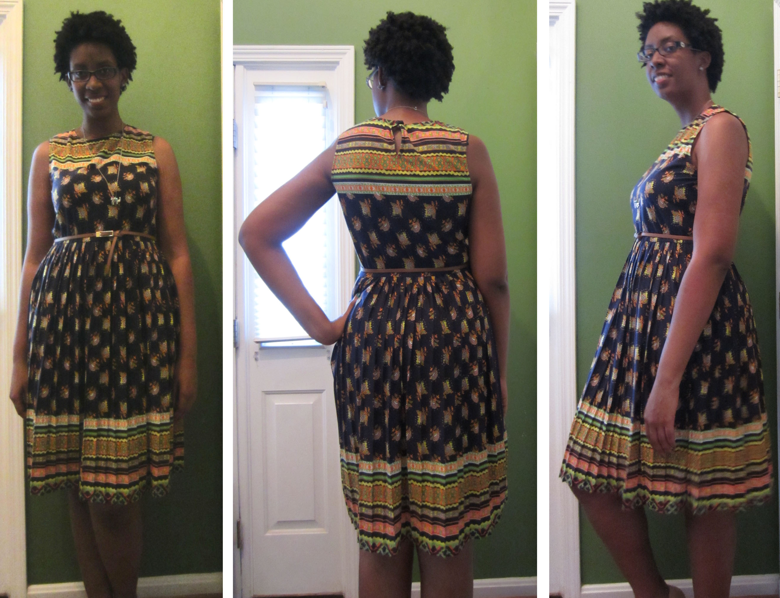 The ASOS Midi Dress in Vintage Floral with Pleated Skirt is a lovely sleeveless, lightweight dress made with a really soft and plush fabric. It is so comfy. The pattern reminds me of a Mexican or Aztec print or something like that and the colors are so pretty. The dress is a deep blue that looks almost purple in the light with spots of lime green, orange, yellow, pink and white. The pattern uses very geometric, polygon shapes but also organic shapes like little flowers and hearts. The dress came with a thin brown belt and it comes in sizes 0-14.