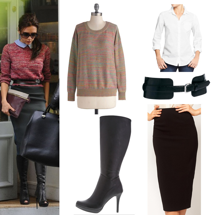 The sweater was the most difficult find. I managed to find one similar to it but unfortunately it is not tall sized so most likely the sleeves will not be long enough. The upside is you can just wear it with the sleeves rolled up like VB (or like we do with all the other sweaters in our closets that are not long enough). If you would rather have a tall-sized sweater or if you’re not into the print, you can try the Cable Knit Pullover from The Gap. I couldn’t find a Peter Pan collar blouse like the one pictured, so I opted for a plain button up instead.