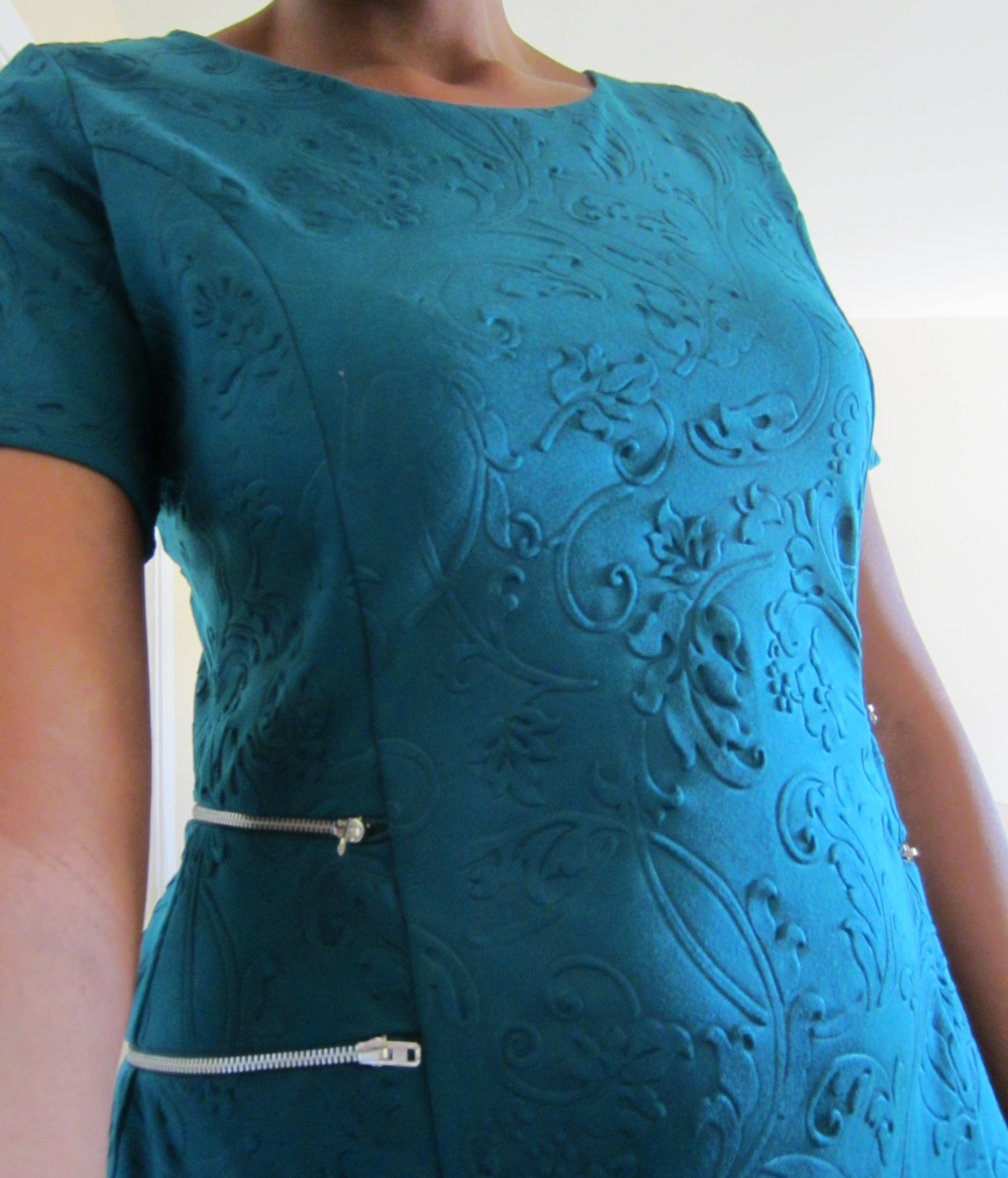 The Embossed Baroque dress is just what the name suggests. It is a teal, short sleeved ponte knee-length shift dress with an embossed baroque-like pattern. And I love the pattern of this dress. I like that the print is more tactile than your average printed dress. You can feel the ridges of the leaves and curlicues of the pattern. It’s kinda cool. The non-functioning zippers on the hips add a modern touch and I think the fact that the pattern is raised updates it a bit as well.