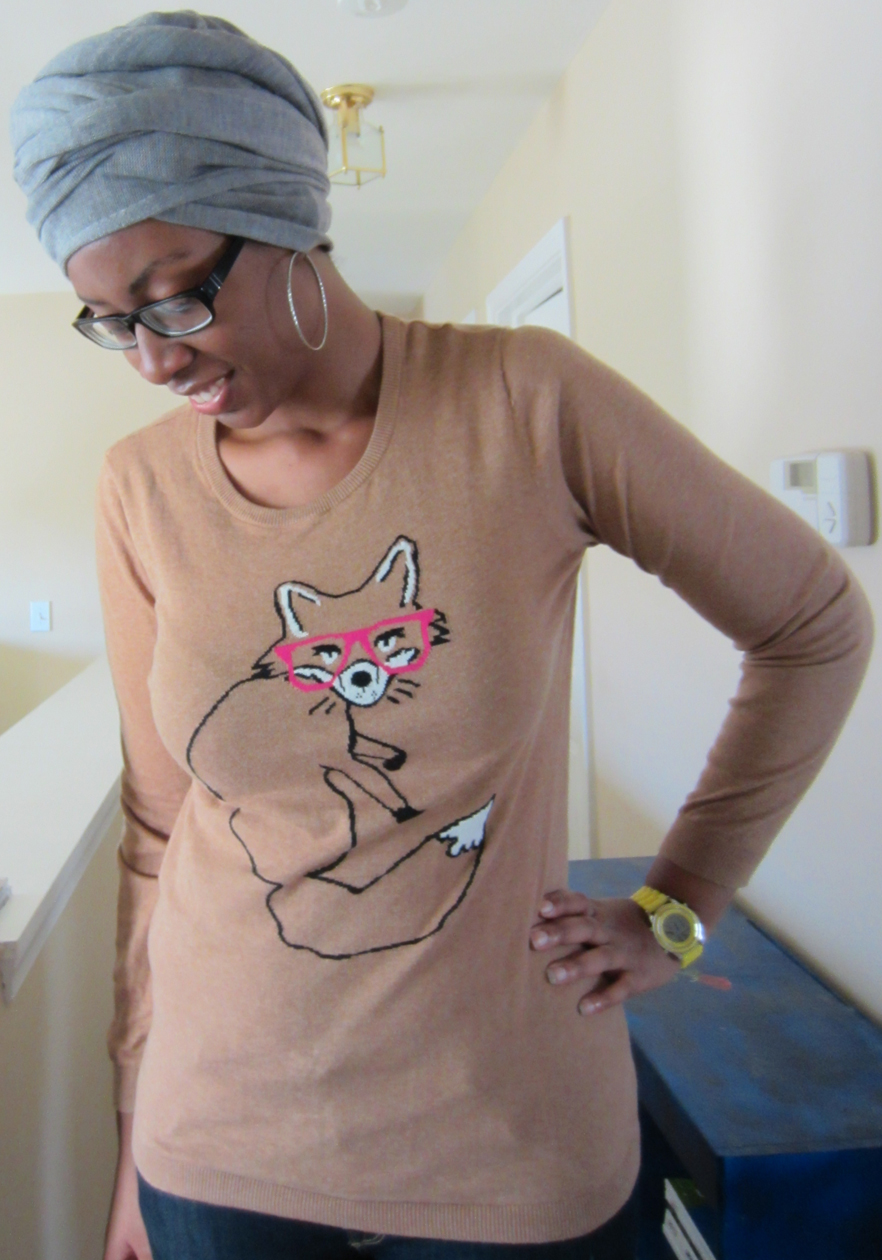 I also needed some sweaters because of the distinct lack of sweaters in my wardrobe. Like I said it’s been cold here, so I can’t go out in t-shirts and such. I saw the fox sweater on the the Old Navy site and I had to have it. I was immediately drawn to it mostly because of the glasses. Whenever I wear it I like to say that I’m a fox with glasses lol. This sweater is made out of a very soft, non-itchy material. The first time I wore it, I got a ton of compliments. I wore it with my black high waisted jeans and my Hunger Games boots. This sweater comes in a number of different colors and animals. I think white one with the blue bird is my next purchase. The sleeve length is great. And it is just the right length in the torso.