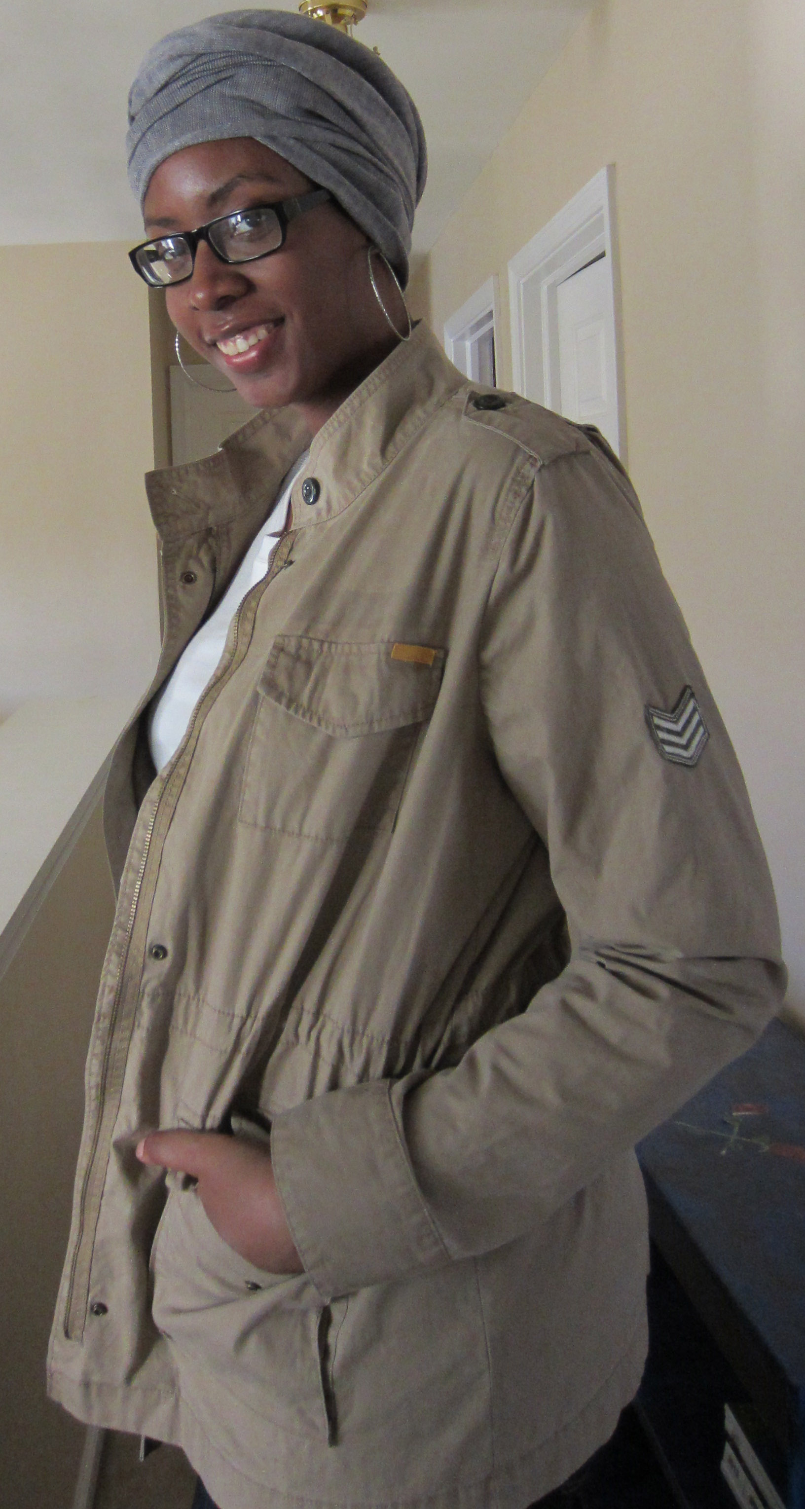 I needed a jacket to wear when it was too cold to go without one but not cold enough to wear my heavy winter coat. And as you know I am kinda obsessed with the military trend so I just had to get this jacket. It is a tan color with a couple military-esque patches on it. The sleeve length is perfect; not too short like most jackets fit on me. The bottom of the jacket stops underneath my behind. This military jacket is great for 65 degree weather not for the 40-50 degree weather we’ve been getting lately. But if I layer it with a hoodie, it’s great. Perfect quick fix. A feature I really like about this jacket is the hidden drawstring waist so it is not just another boxy jacket. I get to show off my shape and be kept warm. (Win Win) One thing I’m not entirely happy with is the pockets. They are nice and deep and they snap closed so my phone and money and etc are kept safe but they open from the top not from the sides so it is a little awkward to keep your hands in when you walk. Just me being nitpicky.