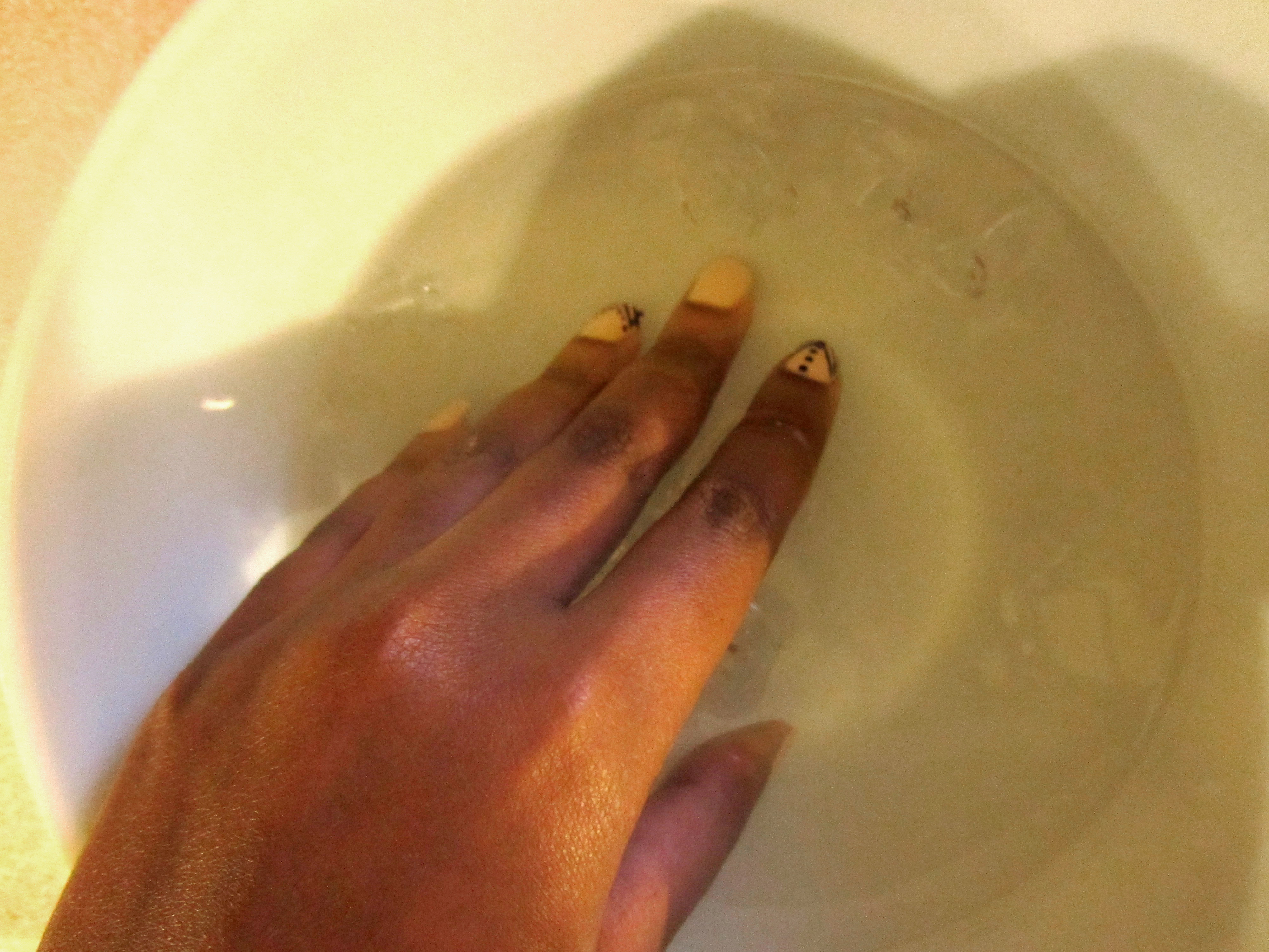 Once the pattern is dry, I top it off with Out the Door topcoat. The pattern must be dry, or the topcoat will make it bleed. I let the topcoat dry for about a minute, then I fill a large bowl with ice water and dip my nails in it until I can’t take the cold anymore (about 2-3 minutes). I got this trick from Pinterest. It dries your nails fast so you can go about your day. I don’t have the patience to wait for my nails to dry.