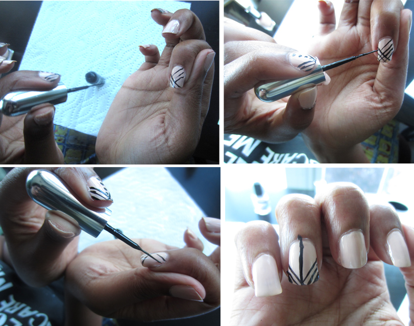 I was inspired by this look but I wanted to use a neutral base color with a black geometric pattern. I love the color combination of the pinky-nude with the stark black.