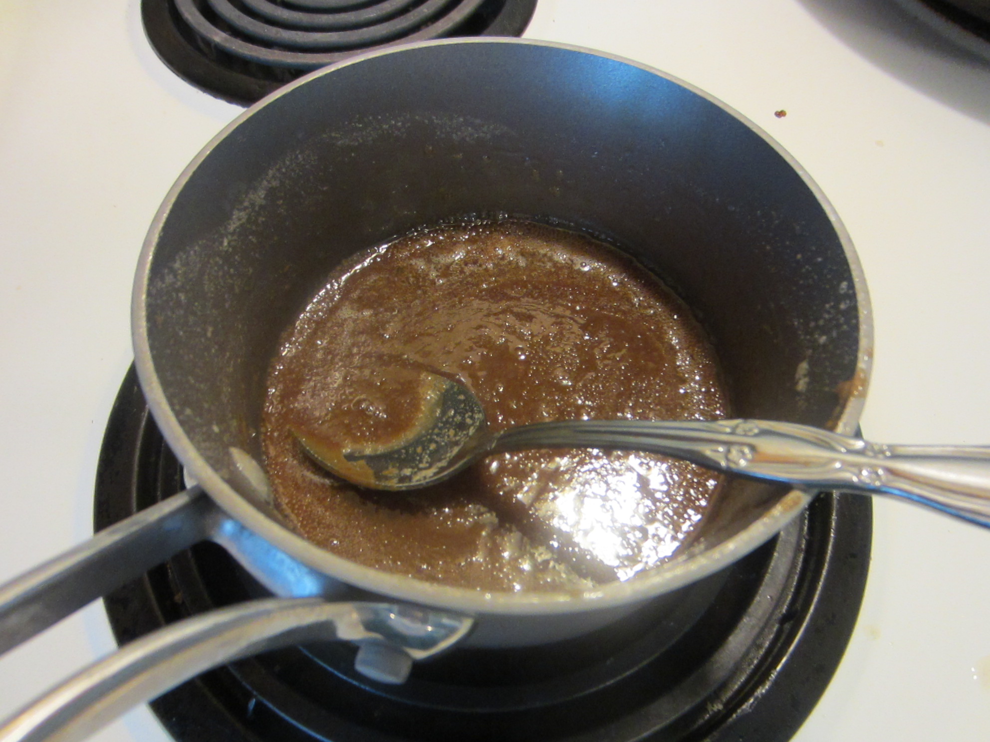 In a small pot (it is best to use a non-stick one) over medium heat, combine the ½ stick of butter and dark brown sugar. Keep stirring it until everything mixes well. When the mixture starts to bubble, let it cook a bit more and take it off the heat. Take your well-greased cupcake pan and spoon in your brown sugar-butter mixture. It is best to spoon in this mixture first, because if you leave it in the pan, it will harden. No big deal, but you will have to reheat it before you are able to spoon it into your pan.