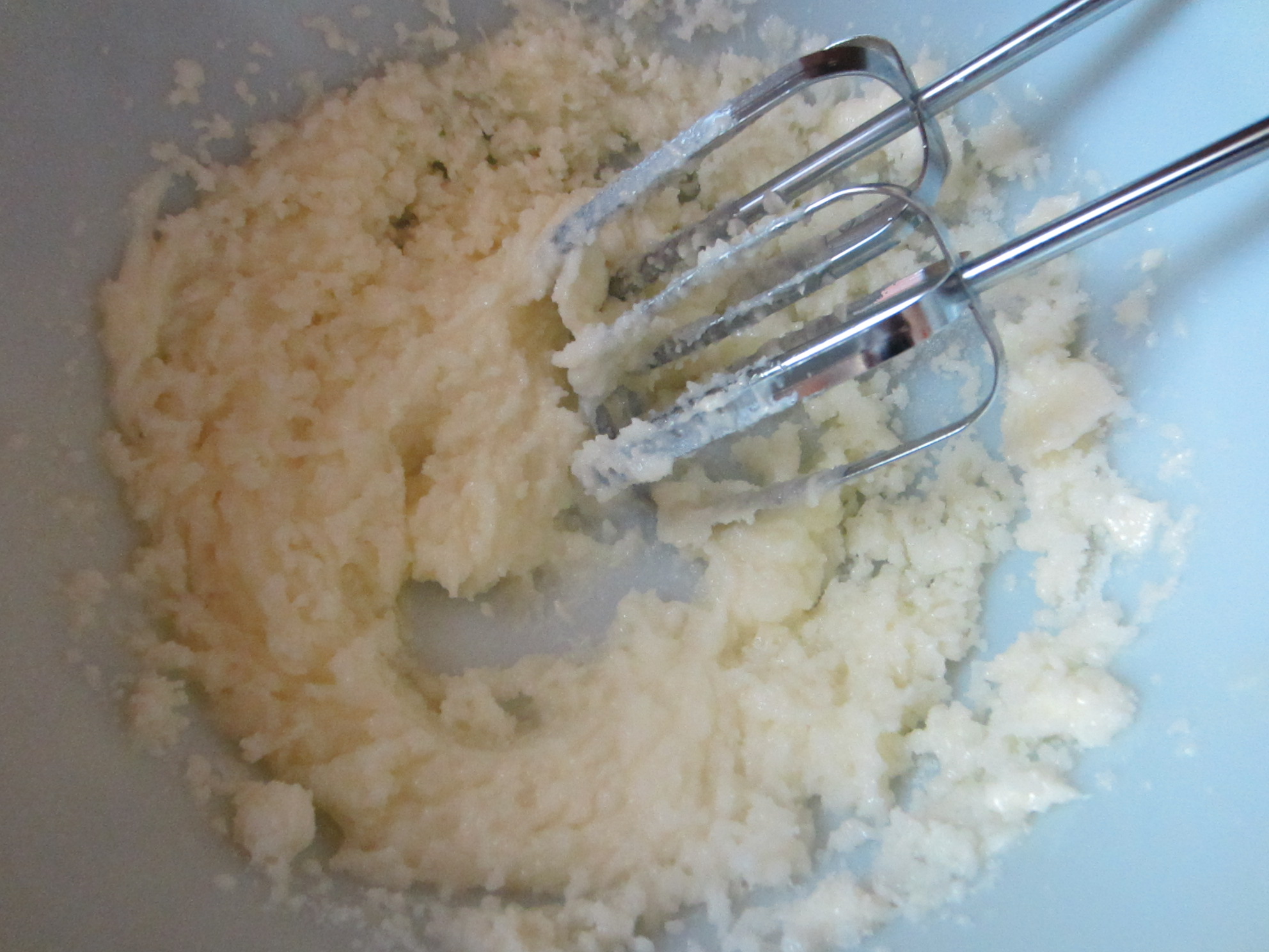 On to the batter. Start with the dry ingredients (minus the sugar): flour, baking powder, cinnamon, and salt and mix together. Set aside. Cream together the butter and sugar. Add in the eggs and vanilla extract. Pour in half the flour mixture. Mix.