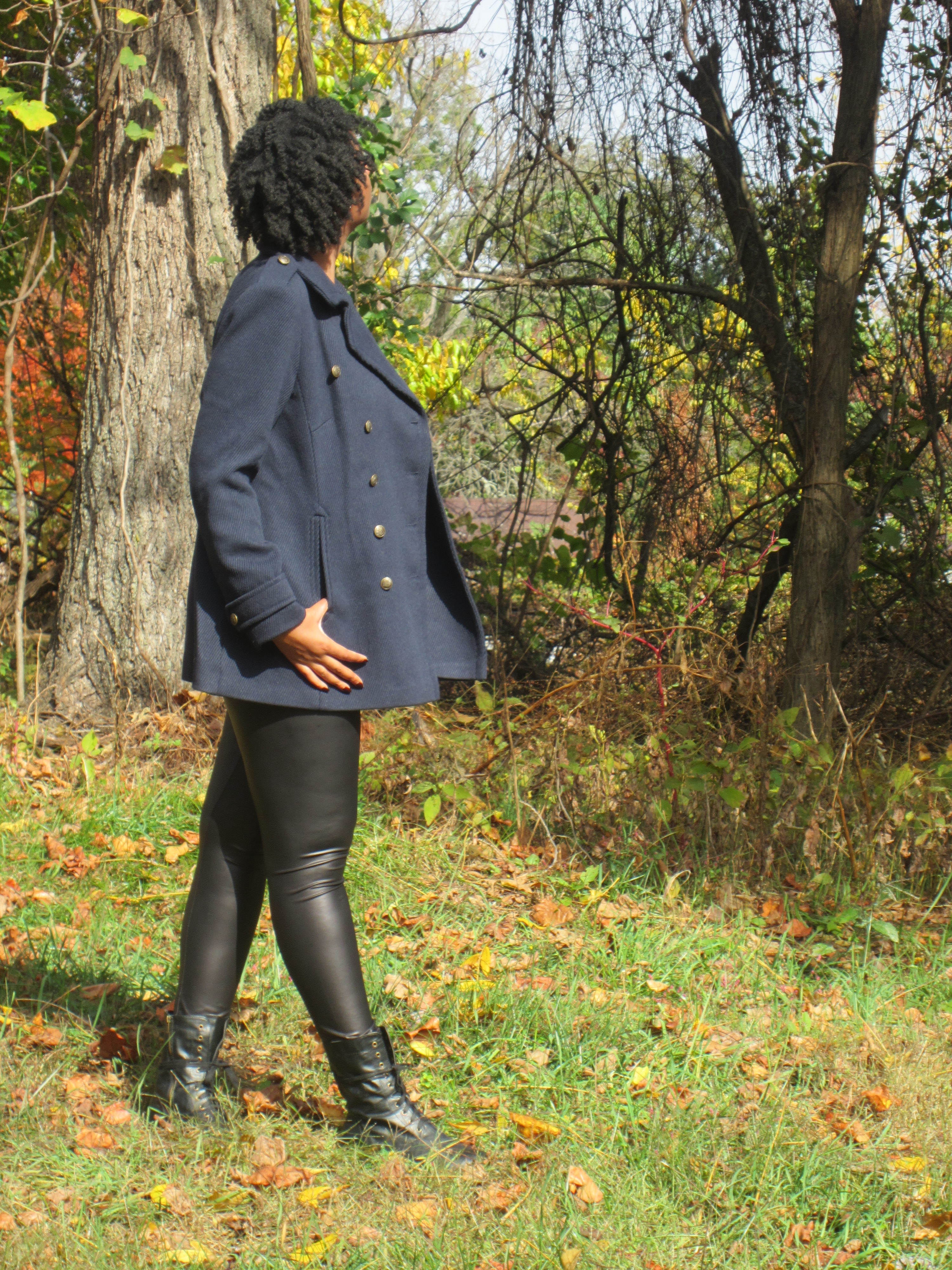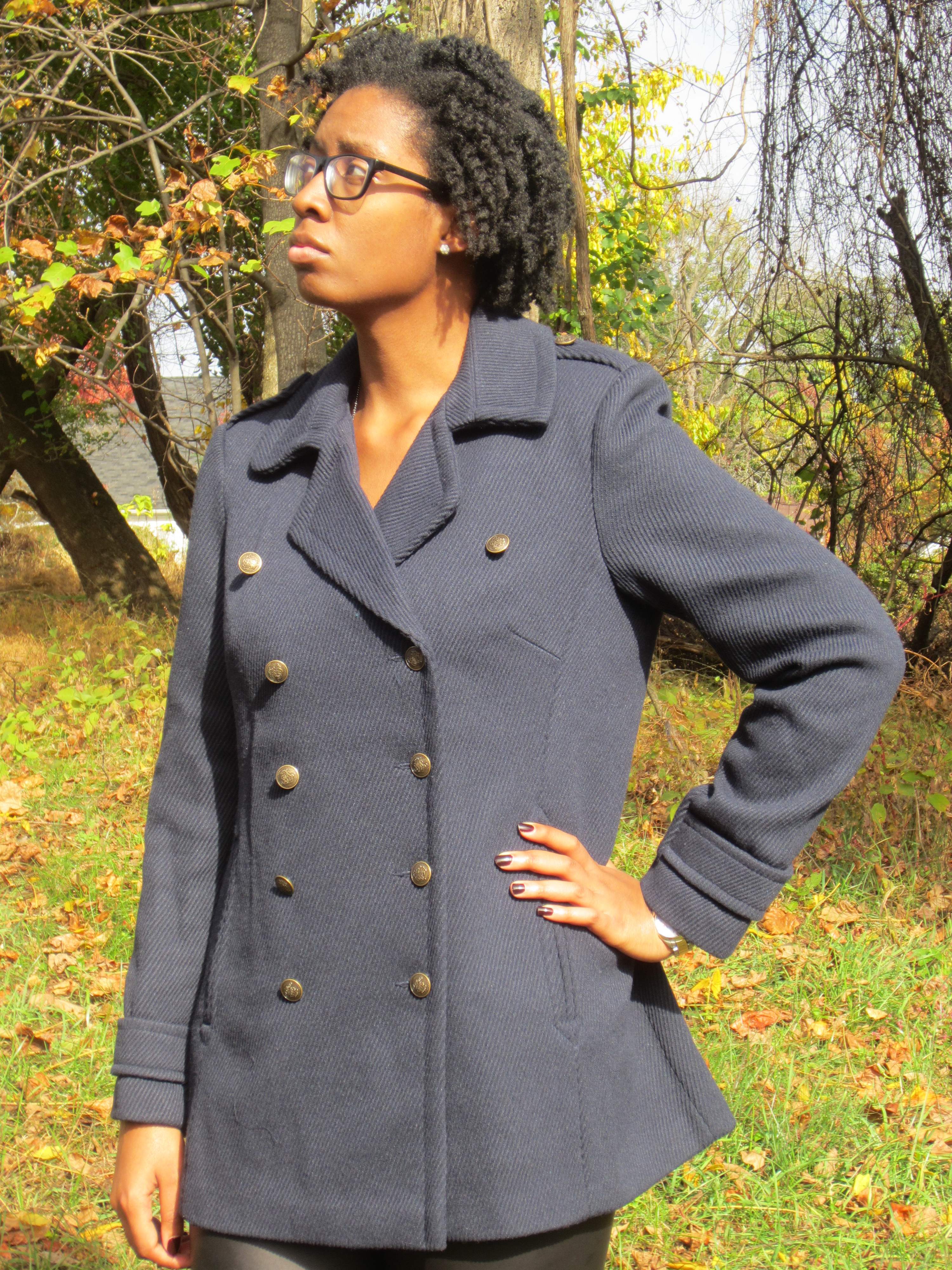 I love the look of the Navy Calvary Twill Coat. I like the mix of the gold military buttons with the navy color. It has an English naval feel about it. I like it a lot.The sleeves are long enough; they hit right below the wrists. The length of the coat is also nice; it hits right below the bum. The coat looks a little big on me, but I am not sure that a 12 would fit any better. Especially if I was wearing a sweater underneath. I think this coat is perfect for the fall or in areas that don’t get that cold. For 2 reasons: the pockets are not functional so you can’t put your hands in them if they are cold and the low v-neck collar will not protect you from blistery cold winds. But I would say that pea coats in general are more for fashion than function anyway.