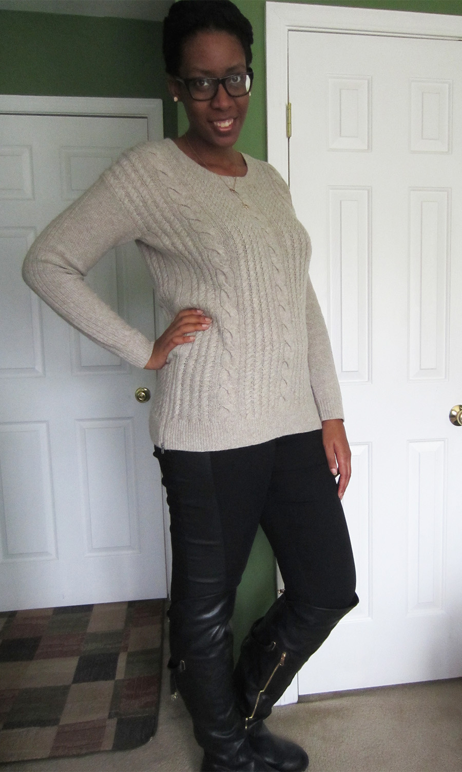 I got the Chunky Cable Sweater in a M and the Biker Paneled Legging Jeans in a 14. These are really nice pieces especially the jeans.
