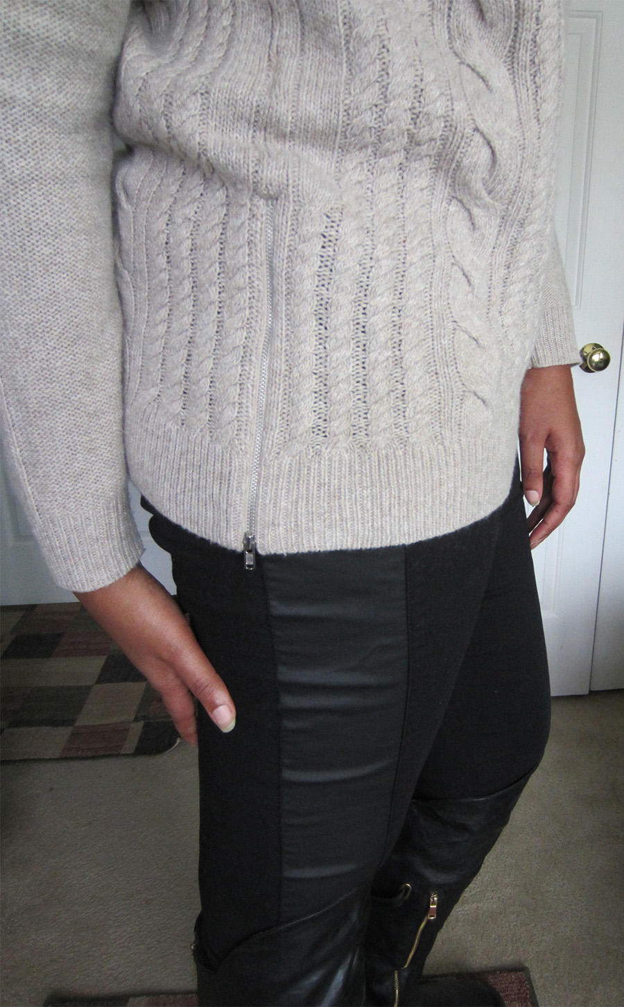 I love the great little details on these pants like the exposed zipper on the back, the leather panel down the sides. Cool and chic. The leather “biker” detail down the side is a nice touch. One drawback is that there are no pockets. But I think that pockets would disrupt the clean smooth lines of the pants so I won’t deduct any points. The pants hit right above my ankles.